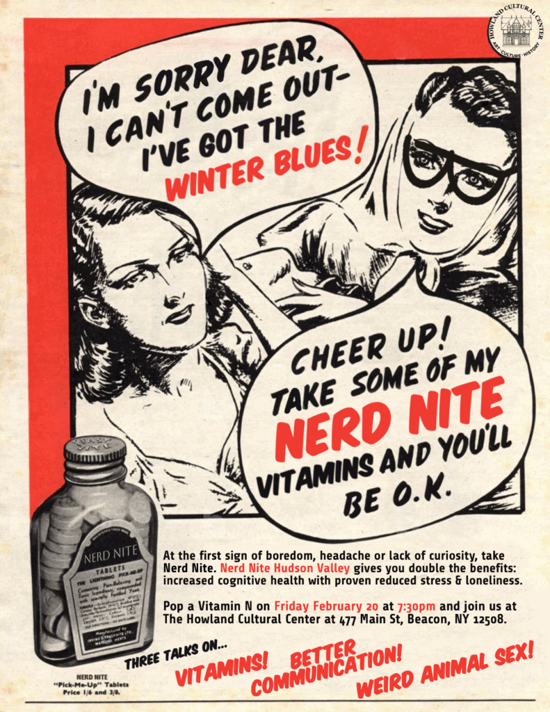 We hear from Dr. Anthony Basile, Associate Professor of Biology at SUNY Sullivan with: “For the Love of Vitamins.” Did you hear the news? Vitamin D BOOSTS your metabolism of Nerd Nite! We all talk about the vitamins, see them written on our food labels, and eat them every day. Yet most people fail to appreciate how amazing the vitamins actually are. No, this talk is not about vitamin supplements. Instead, this talk is about the little bits of organic chemistry that we must eat every day to live. Why Because evolution has left us fully dependent on eating other species for nourishment. From A to K, this talk will present the vitamins as spectacles of human biology!